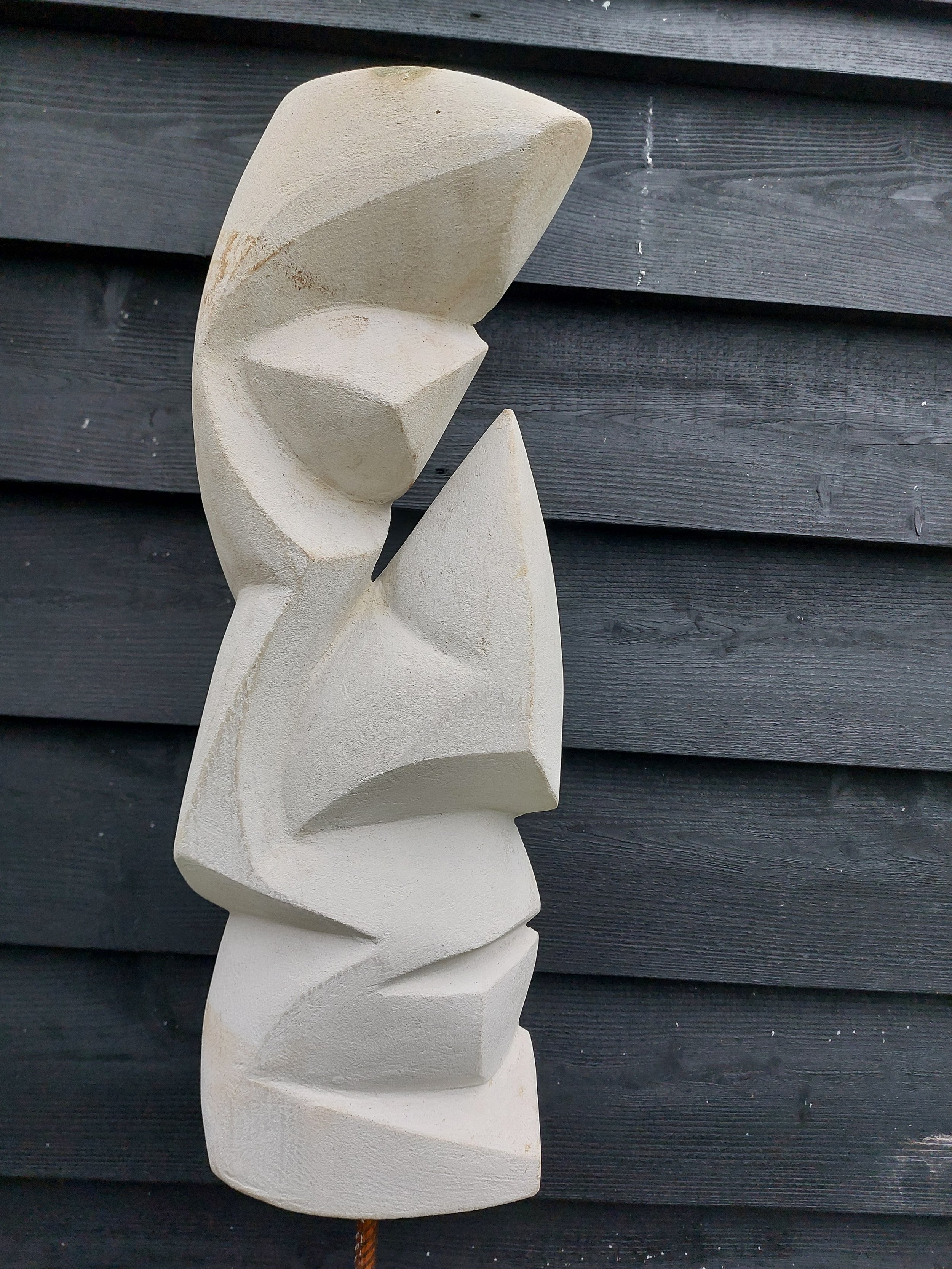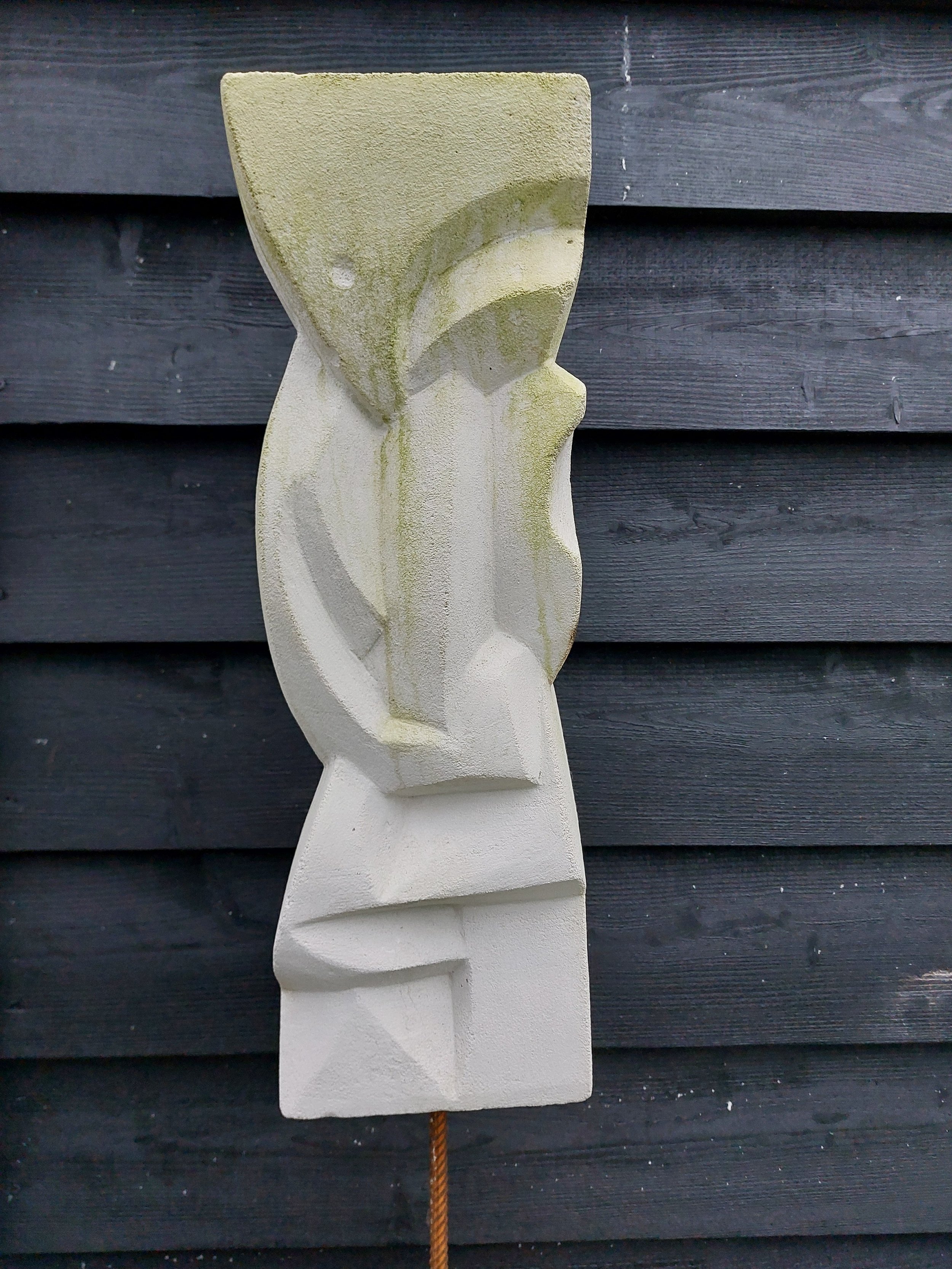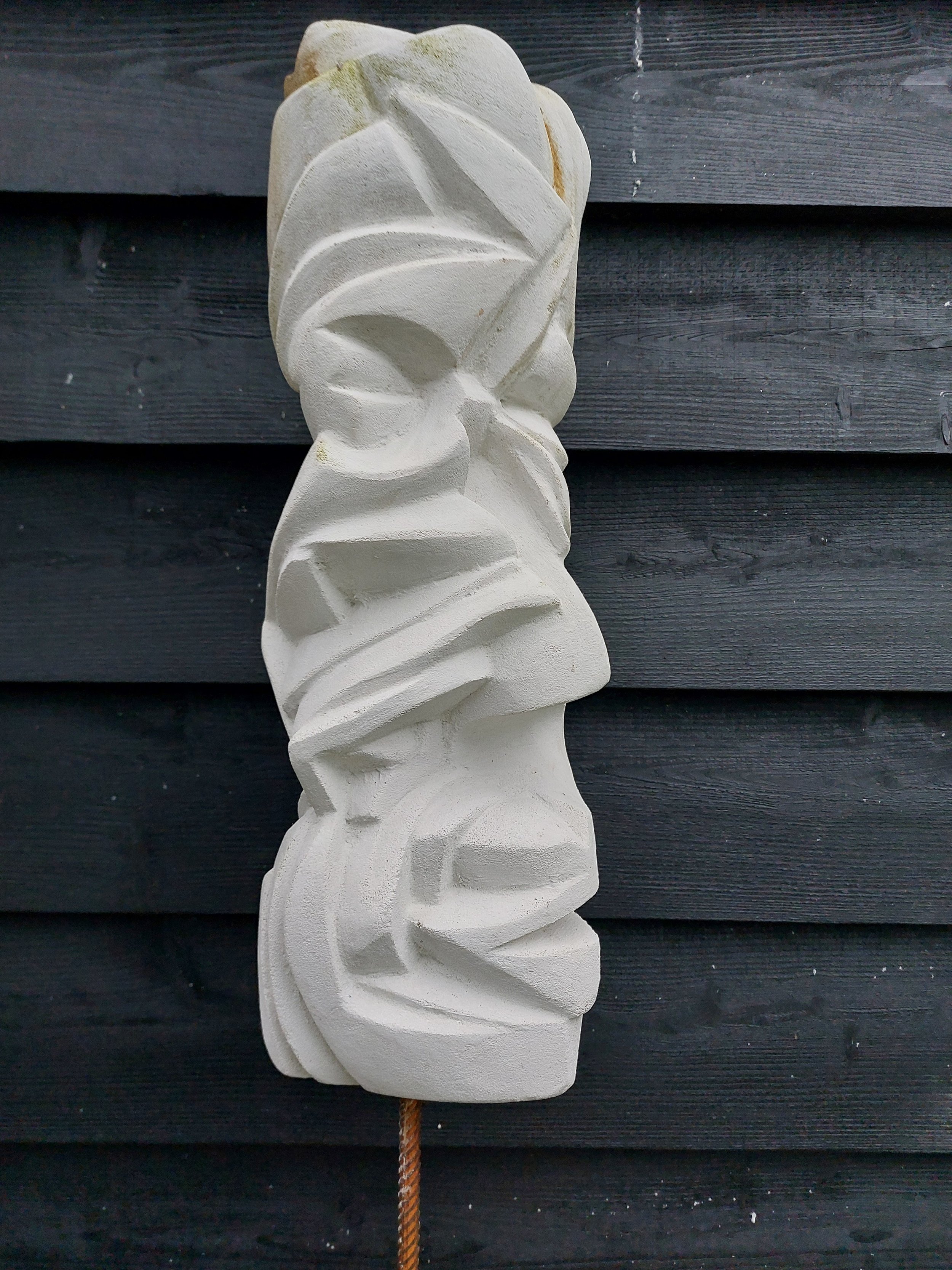 Binnenshuis hebben de beelden geen coating nodig. Ze ogen dan grijzer, maar zelfs tegen een witte ondergrond komen ze goed naar voren. De scherpe hoeken en diepe groeven geven, ook zonder belichting, veel contrast tussen de grijswitte steen en de donkere schaduwen.