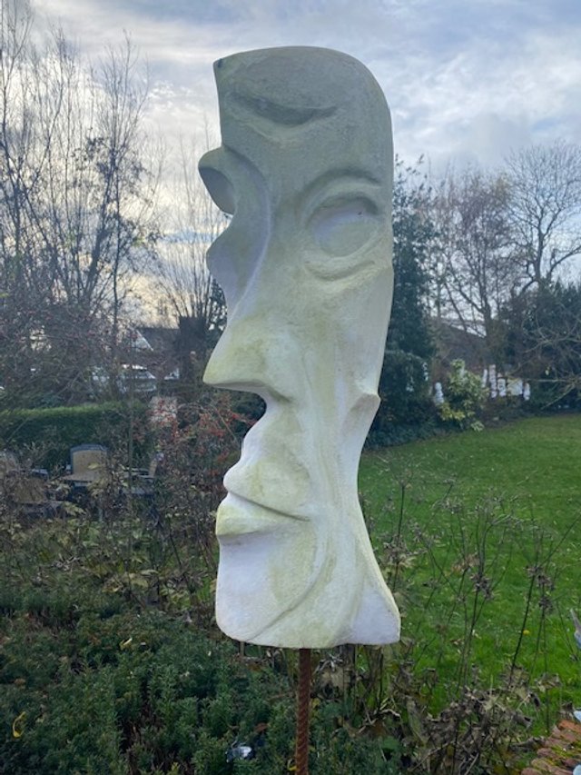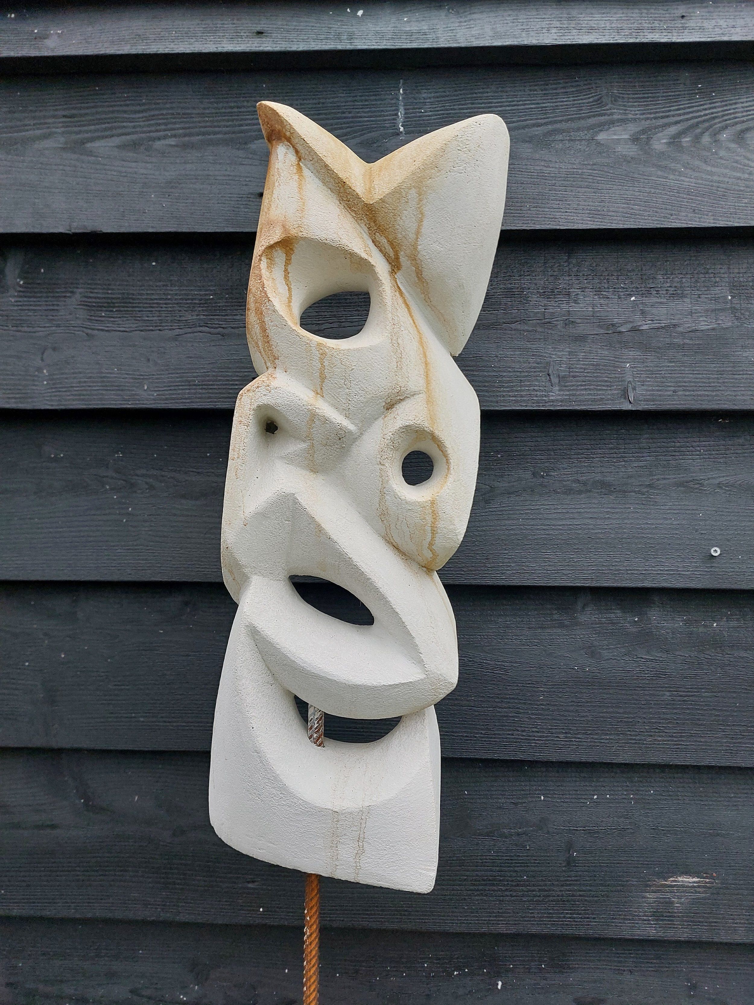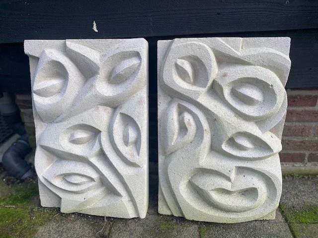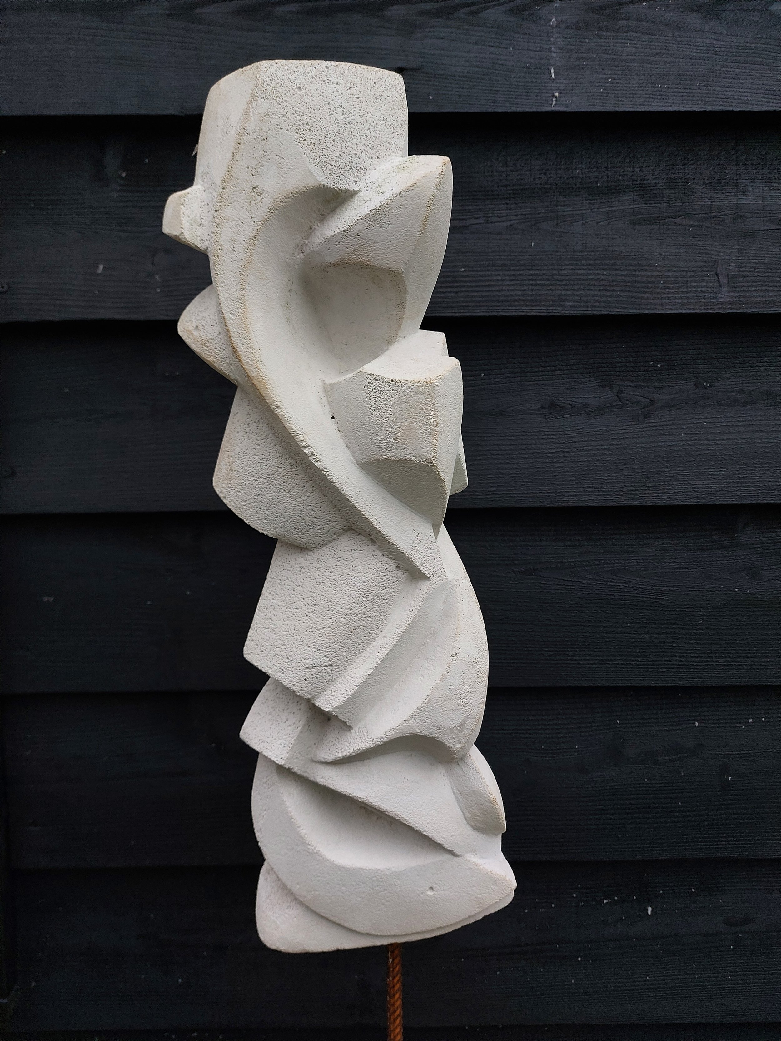 Binnenshuis hebben de beelden geen coating nodig. Ze ogen dan grijzer, maar zelfs tegen een witte ondergrond komen ze goed naar voren. De scherpe hoeken en diepe groeven geven, ook zonder belichting, veel contrast tussen de grijswitte steen en de donkere schaduwen.